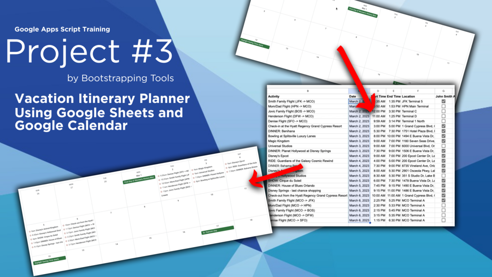 In project 3, we'll go over how to write a script that pulls data from a Google Sheet and automatically creates or updates Google Calendar Events with the event information, start/end times, and its attendees. In the project, we'll create one for a family vacation to Disney but you can use this for just about any kind of event that you want to keep more organized. Whether that's work events, conference events, or personal events with large groups of family or friends - this script will help you absolutely crush the organization of your events.